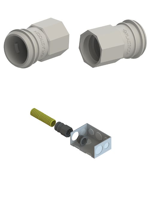 Para as seções de 1.1/4” e 1.1/2”, rosca interna para conexão de eletroduto corrugado flexível tipo Spiraflex em quadro de disjuntores, quadros elétricos, caixas de passagem e/ou caixas de derivação (Utilização do conjunto Luva Multiuso® e Bucha Quick Finish® ).